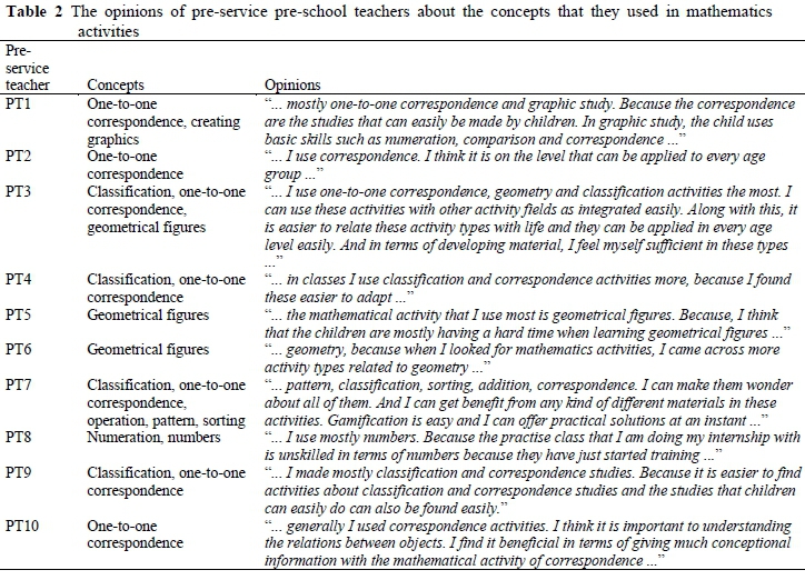 From Table 1 it is clear that the pre-service teachers used one-to-one correspondence (f = 7), classification (f= 4) and geometrical figures (f= 3) the most in mathematics activities. It is also clear that numbers/numeration, operation, pattern, sorting and creating graphics were only used once and time and measuring concepts were used almost never. The pre-service pre-school teachers' opinions on the results in Table 1 were examined in detail (see Table 2).