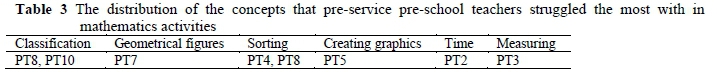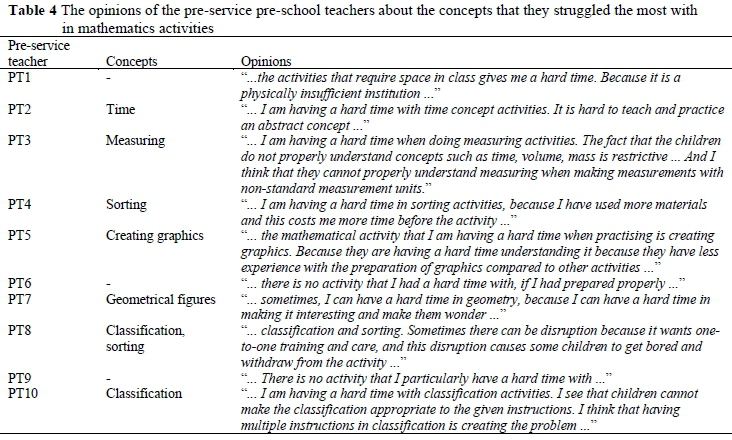 From Table 3 it is clear that pre-service preschool teachers struggled most with classification, geometrical figures, sorting, charting, time, and measuring. The pre-service pre-school teachers' opinions on the results in Table 3 were examined in detail (see Table 4).
