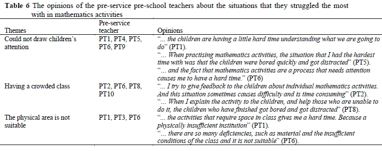 From Table 5 it is clear that the pre-service pre-school teachers struggled most with capturing the children's attention f = 5), having a crowded class f = 4) and the unsuitability of the physical area (f = 3). The pre-service pre-school teachers' opinions on the results in Table 5 were examined in detail (see Table 6).