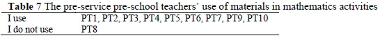 4) What are the pre-service pre-school teachers' use of materials in mathematics activities?