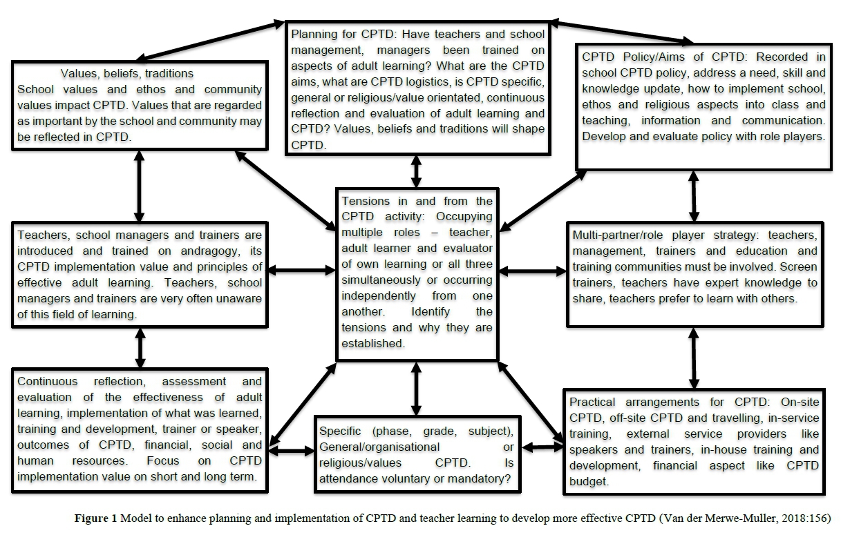 In conclusion, we illuminated the importance to improve decision-making, practice and policy development when planning and implementing CPTD for all adult learners in order for them to learn and develop optimally. Thorough and in-depth planning includes ways for creating opportunities for teachers to learn from their peers in an active learning-teaching dynamic that takes the individual adult learners' CPTD requirements and specific context into careful consideration.