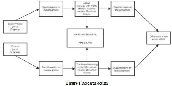 After equalising Groups E and C, students' metacognition in both groups was evaluated using a questionnaire on metacognition. After that, group E was taught the prepared two physics topics: (1) Mass and Density and (2) Pressure, by applying the mKWL strategy with the TQHL chart. The students in Group C were exposed to the same content using the common (traditional) teaching approach without the TQHL chart. Both topics were determined by the regular elementary school curriculum and included in total 12 teaching units.