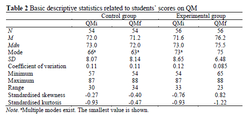 Raw scores on the questionnaire on metacognition (QMi and QMf) were treated statistically using the software package IBM SPSS Statistics 20 and Microsoft Office Excel. The first part of the analysis included descriptive statistics. Since QMi and QMf data proved to be normally distributed, which was confirmed by the obtained values of standardised skewness and standardised kurtosis (cf. Table 2) and by the results of the Shapiro-Wilk test of normality (QMi scores of the students in Group C: W = .97, p = .19, and in Group E: W = .97, p = .12), a paired sample t-tests were used to compare students' metacognition on the pre-test and post-test for Group E and Group C. Additionally, to compare the post-test scores (QMf) between students in Groups E and C, an independent sample t-test was used.
