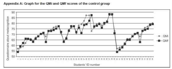 At the beginning of the experiment, before the TQHL chart was used in Group E, there was no significant difference between the result of students in Groups E and C (QMi score) on the questionnaire on metacognition. However, after introducing the experimental factor (the mKWL strategy with the TQHL chart) in Group E and using the traditional teaching approach with student in Group C, the significant difference in the results on the questionnaire on metacognition before (QMi score) and after the experiment (QMf score) was only found in Group E. Additionally, the significant difference in the QMf scores between the students in Groups E and C, in favour of Group E, was evident.