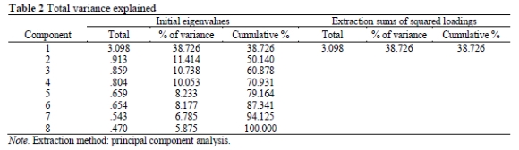 As mentioned, a forced one-factor solution had to be run for Section 2, and items with a communality score lower than 0.25 were deleted. The alpha score for that factor was satisfactory (see Table 1). This yielded a single factor consisting of eight items. A factor analysis after adapting the original number of items in the section resulted in a scale that reflected the state of discipline among children at home and met the criteria for validity and reliability. Tables 2 and 3 contain the results of the factor analysis applied to the data of Section 2. The table reflects the eight components (factors) that, among them, explained the variance with respect to the state of discipline among children at home. Table 3, in turn, explains which items in the questionnaire loaded high onto Component 1 (Factor 1) and hence explained most of the variance, namely 38%.