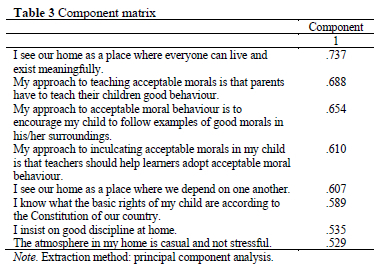 The next task was to determine the parents' perspectives regarding the management of learner discipline in schools. Six statements in the section yielded two factors that proved to be difficult to label due to their heterogeneous composition. The alpha scores of both were also too low. Section 3 was found not to be an appropriate instrument for determining the parents' perspectives regarding the management of learner discipline in schools.