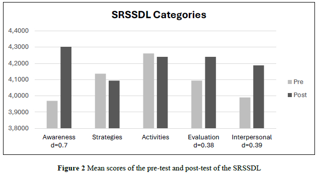Figures 2 and 3 illustrate the results obtained from the research. When looking at the individual categories of the SRSSDL (see Figure 2), the paired sample statistics indicate that awareness increased with medium effect (d = 0.7). Participants thus showed improved understanding of the factors that contribute to SDL (see Williamson, 2007:70). An increase in evaluation (d = 0.38) and interpersonal skills (d = 0.39) was observed, both reflecting small effects. The decrease in learning strategies and learning activities reflected little to minimal change, as reflected in the effect sizes. Van der Walt (2014:7) states that participants initially often overestimate their SDL readiness. The improved awareness may, therefore, suggest that participants had become more conscious of their learning strategies and activities and had realised that they had previously overestimated their SDL readiness in these categories.