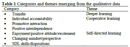 Table 1 summarises the categories and themes that emerged from the qualitative data (gathered from the students' reflective journal blogs).
