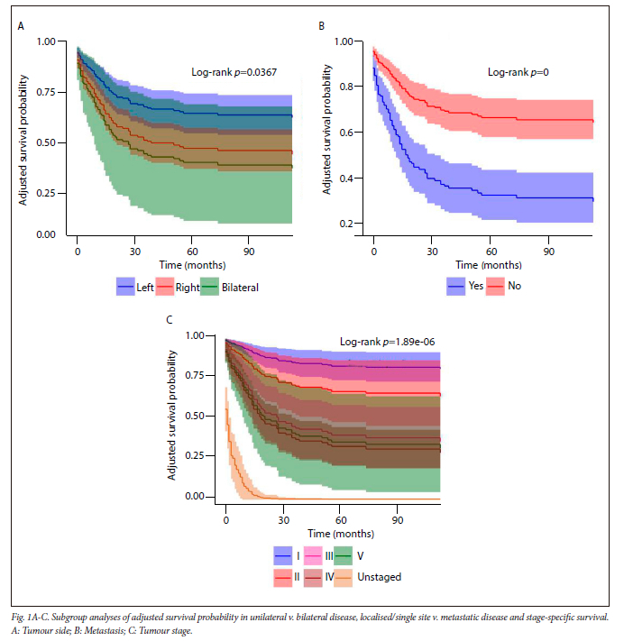 Regarding Kaplan-Meier survival curves, we agree that additional subgroup analyses (e.g. unilateral v. bilateral disease, localised/single site v. metastatic disease, stage-specific survival) would be valuable. These results are shown in Fig. 1A-C, and discussed as follows.