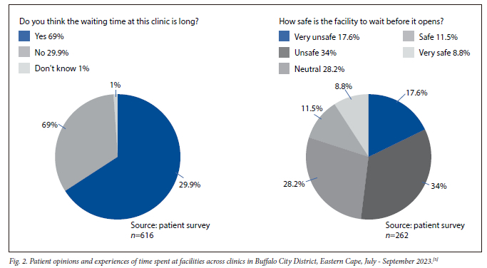 Another way of presenting data on time spent at facilities is shown in Fig. 2, reporting on patient opinions and experiences of waiting periods. Here again, the cross-sectional results for one specific district (Buffalo City, in the Eastern Cape Province) are shown for one quarter in 2023. As with duration of time spent at facilities, these figures are also available for district and provincial levels.