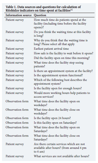 Table 1 shows the information sources for data on time spent at facilities, where each indicator comes from different surveys and/or tools.