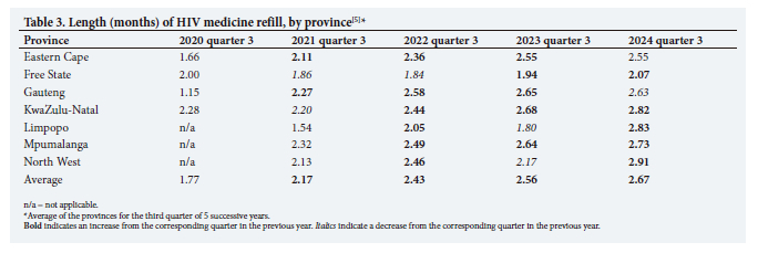 Table 3 gives the average number of months, obtained in patient surveys, for which HIV ARV medicines were prescribed in the third quarter of successive years, by province. This indicator is referred to as 'length of HIV medicines refill'. The provincial average, which summarises all the surveys done at all the Ritshidze-monitored facilities in the seven provinces, shows an overall increase from 1.77 months in the quarter April - June 2020 to 2.67 months in the quarter April - June 2024. As there were also changes in the official guidelines regarding the dispensing of ART during this time, it is difficult to ascribe the improvements directly to Ritshidze without doing additional research.