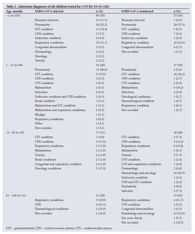 A total of 320 participants aged 0 - 12 years were included in the study. No admissions were done primarily for COVID-19. No patients were excluded. The study occurred in Bloemfontein, at the Pelonomi and Universitas Academic hospitals, from August 2022 to April 2023. Ethical permission was obtained from the University of the Free State before the commencement of the study (ref. no. UFS-HSD2022/1456/2609) in accordance with the Declaration of Helsinki. Informed consent was obtained from parents and legal guardians, and assent was obtained from children >7 years of age. This prospective cross-sectional study consisted of children admitted for various reasons; interestingly, none were admitted for suspected SARS-CoV-2 infection. Participants were randomly recruited from general paediatric wards and specialised wards such as paediatric oncology, cardiology and paediatric intensive care units at both hospitals. Their COVID-19 status was unknown during recruitment as SARS-CoV-2 screening upon admission was no longer standard practice during the period that the study was conducted. The children were categorised into different age groups (<1 month, 1 - 12 months, 13 - 60 months, 61 - 144 months). Babies who were born prematurely and were admitted for >1 month were categorised in the 1-month - 12-month group. Children were tested for SARS-CoV-2 antibodies following consent from their parents or caregivers. The nucleocapsid antibody testing technique (Roche) was used to measure the presence of antibodies (IgG/IgM rapid COVID test) in children. A drop of blood was obtained on admission during their routine daily blood withdrawal procedures. SARS-CoV-2 infection in children was confirmed by the presence of both immunoglobulin G (IgG) and immunoglobulin M (IgM) antibodies. The results include all children tested, with and without COVID-19 infection.