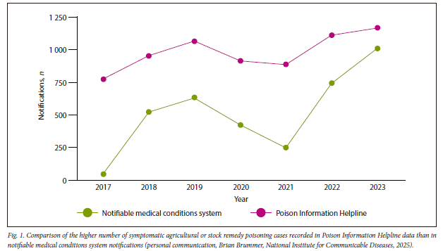 Agricultural or stock remedy (pesticide), lead and mercury poisoning continue to constitute important public health risks in SA, associated with morbidity and mortality, from both intentional and unintentional exposures. A well-designed and operated NMC system offers an invaluable tool for tracking, analysis and response to cases or patterns of key diseases, and specific environmental poisonings. The NMC system represents a relatively low-cost public health tool for the rapid identification of cases or outbreaks, and swift intervention.
