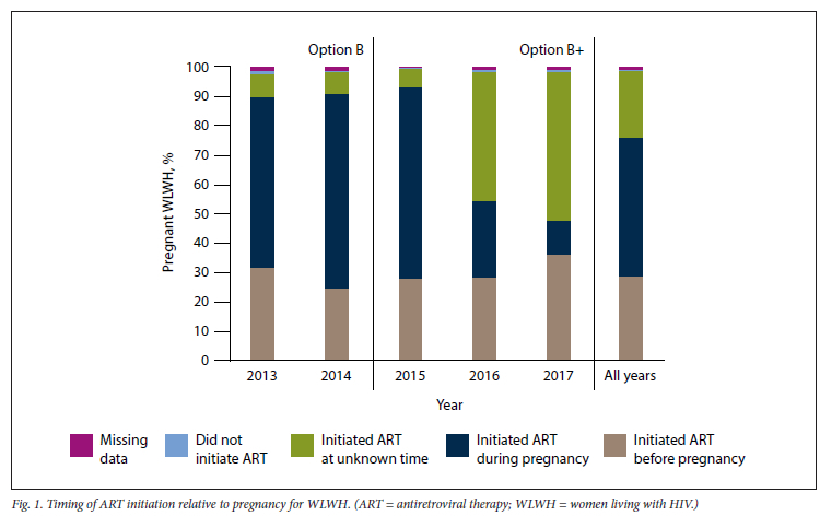 Most WLWH in this cohort started on ART prior to delivery. We found that the proportion of WLWH with known ART initiation dates who initiated ART prior to their pregnancy was higher in the Option B+ era than the Option B era. Specifically, in 2017, excluding those with missing data, 76% of WLWH in this cohort were on ART before their current pregnancy. In our results, 98% of WLWH across 2013 - 2017 received ART at some point before or during their pregnancy. This result is similar to what was found in the National Antenatal Sentinel HIV Survey,[14] where 87% of women in 2017 knew their HIV status, and 96% in 2019 were receiving ART at the time they were surveyed during pregnancy.[14] These estimates are still short of the Joint United Nations Programme on HIV/AIDS (UNAIDS) 2025 goal to have 90% of pregnant WLWH already initiated on ART before conception.[10] To ensure that >90% of pregnant WLWH are on ART at conception or prior to pregnancy, vertical transmission prevention programmes should use data to identify gaps in ART coverage among women of childbearing age and adjust programmes accordingly. While SA's PMTCT programme currently enforces universal HIV testing and has significantly expanded ART access among pregnant and postpartum women, healthcare providers can further strengthen these efforts by educating WLWH on the importance of ART before pregnancy.