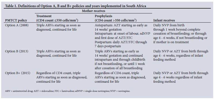 SA's policy for providing antiretroviral therapy (ART) to pregnant women living with HIV (WLWH) has evolved over time, following World Health Organization (WHO) recommendations (Table 1). In April 2008, a dual-therapy PMTCT programme was implemented through which women were offered zidovudine starting at 28 weeks' gestation, or ART at a CD4 count <200 cells/μL.[3] Option A was introduced with zidovudine given starting at 14 weeks' gestation for women with a CD4 count >350 cells/μL, or triple-drug ART for women with a CD4 count <350 cells/μL.[4] Option A was replaced in 2013 by the WHO-recommended Option B approach, where women were offered triple-drug therapy, with postpartum withdrawal of antiretrovirals after cessation of breastfeeding for those ineligible for lifelong treatment.[5] The progression from Option B to Option B+ in 2015, where pregnant WLWH were offered lifetime ART regardless of CD4 count, was one of the key developments in the SA national HIV policy.[6]