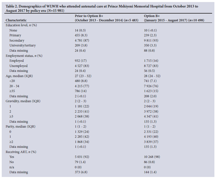 A total of 40 318 HIV-positive and HIV-negative pregnant women with a median (interquartile range) age of 24 (20 - 30) years attended ANC at Prince Mshiyeni Memorial Hospital from October 2013 to August 2017. Of these, 15 988 (39.7%) were WLWH, 17 of whom could not be assigned to a policy era because of missing data collection dates. Table 2 summarises the characteristics of this study population stratified by the PMTCT policy eras under study. There were no meaningful differences between groups in terms of education, employment status, age, gravidity and parity. However, a higher proportion of WLWH received ART during the Option B+ era (98%) than the period before Option B+ (92%).