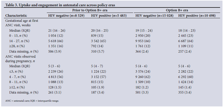 OBJECTIVE: To determine whether engagement in antenatal and HIV care among pregnant women living with HIV (WLWH) differed after Option B+ implementation