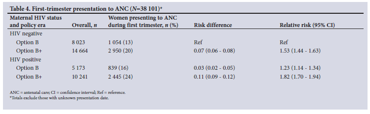 RESULTS: Data from 40 357 women, including 16 016 (40%) WLWH were analysed. During the Option B+ era, 24% of pregnant WLWH attended their first antenatal care visit during the first trimester, compared with 16% during the Option B era (relative risk 1.52; 95% confidence interval 1.41 - 1.64). The proportion of WLWH who initiated ART prior to pregnancy was also higher during the Option B+ era than the Option B era, though this result was limited by missing data