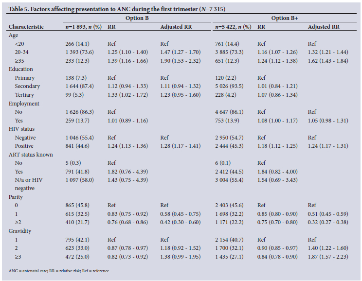 We further assessed the timing of ANC presentation by adjusting factors that may influence the timing of the first ANC visit (Table 5). In both eras older women >35 years were significantly more likely to initiate ANC in the first trimester (Option B: adjusted RR (aRR) 1.93, 95% CI 1.53 - 2.32; Option B+: aRR 1.62, 95% CI 1.43 - 1.84). HIV-positive women had significantly higher odds of early ANC (Option B: aRR 1.28, 95% CI 1.17 - 1.41; Option B+: aRR 1.24, 95% CI 1.17 - 1.31). Higher parity (>2 children) was strongly associated with reduced early ANC attendance (Option B: aRR 0.42, 95% CI 0.30 - 0.60; Option B+: aRR 0.32, 95% CI 0.27 - 0.38). During Option B+, higher gravidity (>3 pregnancies) was associated with early ANC attendance (Option B+: aRR 1.87, 95% CI 1.57 - 2.23).