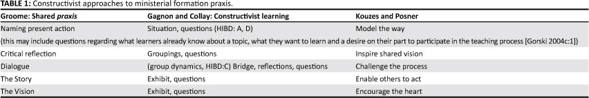 The aim of the proposed constructivist and holistic approach is to design a model for the education of the whole person in the Christian faith ministry. Knowledge of faith matters is not just an intellectual engagement. Groome (1980:56-65) treats it as believing, trusting and doing which brings it into the realm of skills and attitudes and values. It can be enhanced by an understanding and implementation of Hermann's whole brain teaching and learning model (De Boer et al. 1999) and multiple intelligence theory (Copley 2009:72ff.). Then it may promote critical reflection, ethical action and imaginative creativity as a foundation for individual and social praxis. In order for such a model to be fully integrated, it is vital that the learners participate in the structuring and development of the model that is, they need to buy into the idea through a commitment as the result of discerning a need to re-envision their (ministers') 'values and intentions in living our [Christians'] lives' (McNiff 2002:13) and so to 'contribute to the formation of a better society' (McNiff 2002:27) that is through transformation of self, since change is here to stay and this will certainly challenge traditional views for: