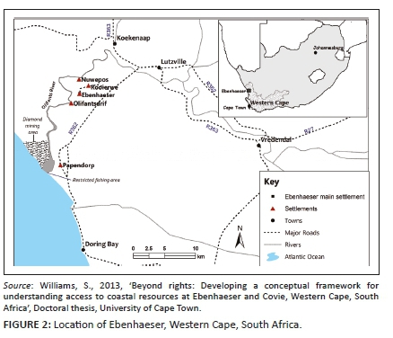 Ebenhaeser is a rural village situated on the lower reaches of the Olifants River on the West Coast of South Africa (See Figure 2). Historically, the Ebenhaeser community lived on fertile land near present day Lutzville (See Figure 2), where a Rhenish mission station was established. Inhabitants had access to fresh water from the Olifants River and were primarily engaged in farming activities and fishing to contribute to their livelihood activities. In 1925, the Ebenhaeser Exchange of Land Act No. 14 saw the removal and resettlement of people from this area to where Ebenhaeser is situated today. After the removal, people made distinction between the 'Old Ebenhezer' and the new area, Ebenhaeser where they were resettled (Williams 2013:150). The 'new' area had less fertile land and the available water was saline, so the potential for farming activities was limited (Sowman 2017:27). Fishing, which already played a role in sustaining livelihoods, became even more important and this activity continues to play an important role in contributing to those livelihoods dependent on it.