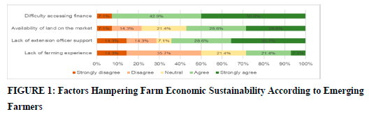 Emerging farmers highlighted the difficulty in accessing finance as hampering their economic sustainability. In addition, the lack of extension officer support and the availability of land on the market were also seen as problematic. However, a lack of farming experience was seen as less problematic (Figure 1).