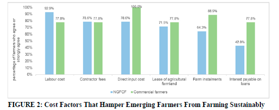 Cost factors that hampered emerging farmers from farming sustainably, as highlighted by the farmers, included the cost of labour, direct input costs, and farm instalments. In addition, contractor fees and leases of agricultural farmland were seen as particularly problematic (Figure 2).