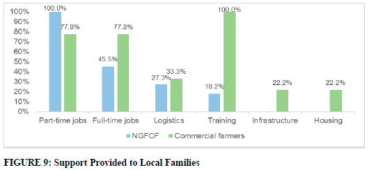 Commercial farmers emphasised the importance of training local families to promote social sustainability. In addition, commercial farmers highlighted providing part-time and full-time jobs to local families as crucial for social sustainability. In line with the views of the commercial farmers, all emerging farmers indicated that they provide part-time jobs to local families, while 45.5% provide full-time jobs. However, in contrast to commercial farmers' views on the importance of training, less than a fifth of emerging farmers indicated that they provide training to local families.