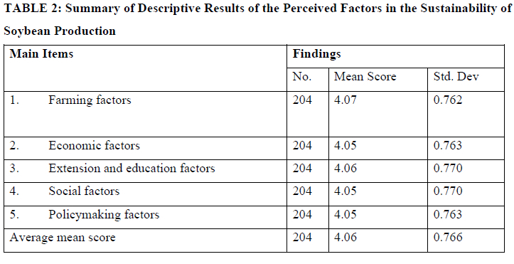 Participants had a strong perception of the role of economic factors in ensuring the long-term viability of soybean production, as indicated by the average mean findings on their views and ideas on these factors. Some factors considered were credit availability for farmers, financial institution assistance, transportation expenses, availability of soybean marketing data, and price stability. These findings align with those of Bicudo Da Silva (2020), who stressed the importance of ready access to farm credit for the successful operation of any farming operation, but especially for the small-scale variety in an era of scarce capital.