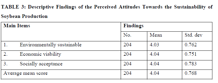 Table 2 presents an overview of the descriptive findings, categorised by the perceived factors contributing to soybean production's sustainability. These factors include farming, economic, extension and education, social, and policymaking aspects. With a sample size of 204, the average mean score and standard deviation are recorded as 4.06 and 0.776%, respectively. Among these factors, farming received the highest average score of 4.07, while economic, social, and policymaking factors obtained the lowest score of 4.05. Moreover, Table 2 highlights that the extension and education factors obtained a mean score of 4.06. The results from Table 2 strongly indicate that participants regarded these factors as highly significant for the sustainability of soybean production in the study area. Table 3 presents the descriptive findings of participants' perceived attitudes towards the sustainability of soybean production.