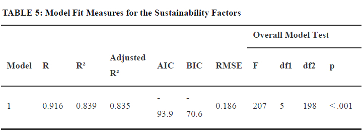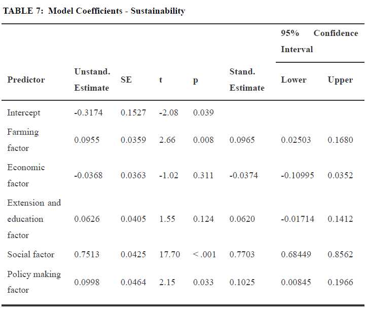 Table 5 presents model fit measures for the sustainability factor. The results R-squared was used to evaluate the model fitness. The model indicates an R-Square value of 0.89, implying that 80% of the variation in the perceived attitudes towards the sustainability of soybean production can be explained by the model containing perceived factors in the sustainability of soybean production at p = < 0.001, adjusted R square = 0.835 and F = 207. This implies that the model's fitness is good.