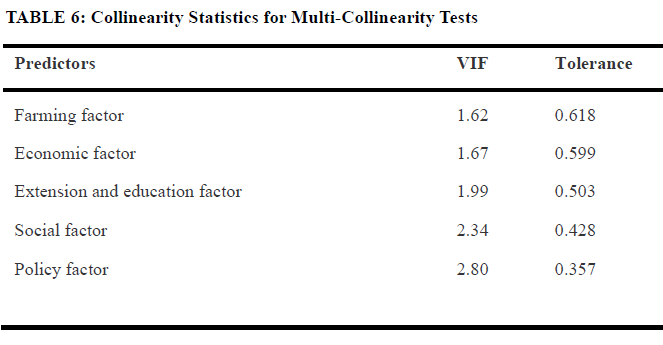 In conclusion, Table 4 suggests a significant relationship between the participants' perceptions of farming, economic, extension and education, social, and policymaking factors and their perceived attitudes towards the sustainability of soybean production. The relationships between the independent and dependent variables were subsequently evaluated using regression analysis.
