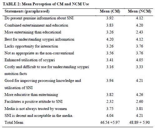 Comparing the mean perception to the two types of media, more women in the study had a positive perception of non-conventional media use for soygari intervention than conventional media. Access to some conventional tools in most African homes is limited because of different cultural or religious beliefs. In such homes, women are not regarded as having control over assets such as television and radio compared to their male counterparts. This demeanour dissuades women from using such tools and influences the negative disposition of the rural women to conventional media use for soygari.