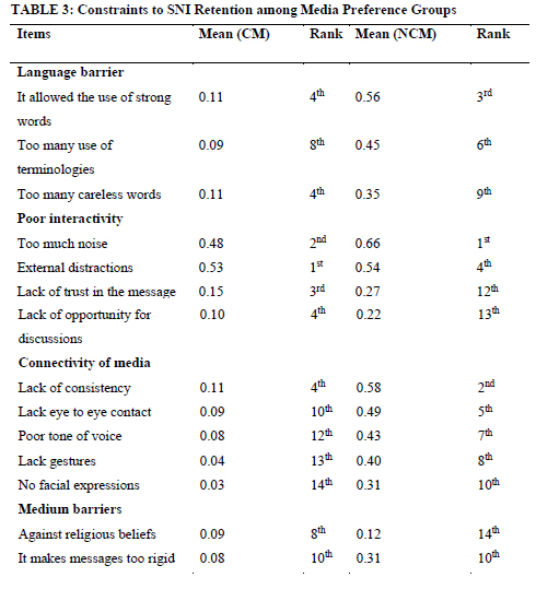 Table 3 presents the constraints identified by respondents from the media used to disseminate SNI. Respondents exposed to conventional media (audio and video) ranked external distractions highest (