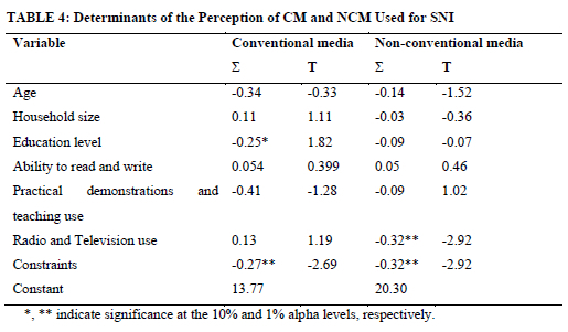 The regression model (Table 4) is significant at the 5.00 percent level. It shows variables on the perception of conventional and non-conventional methods utilised for soygari dissemination. Educational level (Σ = -0.25) and constraints (Σ= - 0.27) influenced the perception of conventional methods utilised while only constraints faced (Σ =-0.32) influenced the perception of non-conventional media use. The influence of constraints and educational level was negative on the perception of conventional methods utilised, and the presence of identified constraints was negative on the analytical perception of non-conventional media use. Audio and television use (Σ =-0.32) influenced the perception of non-conventional media use. The influence of educational level was negative on the perception of conventional methods utilised, and exposure to television and radio was negative on the analytical perception of non-conventional media use. The higher the education level of respondents, the more negative the perception of the conventional methods. The audio and video dissemination methods might not be comprehensive enough for the audience with a higher education level, as they appeal more to the non-educated. The trust, regard, and confidence reposed in the community/women elder as a source of valid information could discourage using mediated information, especially on vital issues such as diet. Television and audio's negative but significant influence on the perception of non-conventional methods suggests an analytical conflict between the television messages and unmediated practical demonstrations. The presentation, the expressions, and possible distractions are some unique factors that differentiate the two mediums of information.