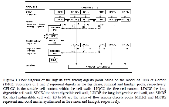 A widely applicable approach for pursuing the goal of predicting the intake of roughage diets for ruminant species would be to use simulation modelling. This study, while remaining fairly simple, will take advantage of some previous generalisations proposed by Poppi et al. (1981a; b), Illius & Gordon (1991) and Sauvant et al. (1996). The model of Illus & Gordon (1991) was originally developed to provide insight into how body size influences the ability of the animal to obtain their energy requirement from poor quality feeds, and so bears the attractive feature of generalizing across ruminant livestock. The aim of this study is to test the suitability of Illius and Gordon's simulation model for predicting the digestibility and intake of tropical roughage based diets by ruminants.