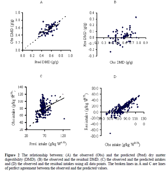 The regression relationship between the observed (Y) and the predicted (X) DM intake (g/g w0.73) is positive, and is represented by the equation: Y = 30.1(SE = 7.39) + 0.71(SE = 0.111) X (n = 234, RSD = 14.62, R2 = 0.15). The intercept and the slope are significantly different (P < 0.001) from zero and unity, respectively. This relationship is depicted in Figure 2C. Residual DM digestibility values were plotted against the observed to assess the overall goodness of the predictions from the simulation (Figure 2D). It can be observed from the plot that the residual intakes increased systematically with increasing intake. Furthermore, the overall cv for the intakes of the feeds used in the field experiments that were used in the model validation is 8.3%. It was observed that 22%, 41%, 66% and 86% of the predicted intakes were 1, 2, 3 and 4 times the SD higher or lower than the observed, respectively. Upon elimination of 5% of the extreme observations, the refitted equation is: Y = 28.7(SE = 6.73) + 0.75(SE = 0.101) X (n = 223, RSD = 12.66, R2 = 0.20). Both the intercept and the slope differ (P < 0.05) from zero and unity, respectively, with the relationship accounting for just 20% of the variation.