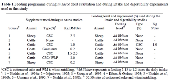 Data from seven suitable studies (i.e. studies that reported all requisite data needed to run the model) in which tropical roughages were fed to ruminants were used to evaluate the simulation model. The seven studies that qualified for the evaluation had 235 intake and 70 digestibility measurements obtained from studies using cattle, goats and sheep. All observations were used. In these studies animals were offered 1.15 to 1.20 of the ad libitum intake and orts were weighed before offering fresh feed (Table 1) during the digestibility and the intake phases. Small ruminants were housed in individual pens during the intake phase but were transferred to metabolism crates during the digestibility phase of the study. However, cattle were housed in tie-stalls during the entire duration of the study and faeces were immediately removed from concrete floors and placed in collection buckets until weighed. Details are given in each of these studies. Animals used for degradation studies in all but the study by Mpairwe (1998) were provided with a protein supplement (Table 1).