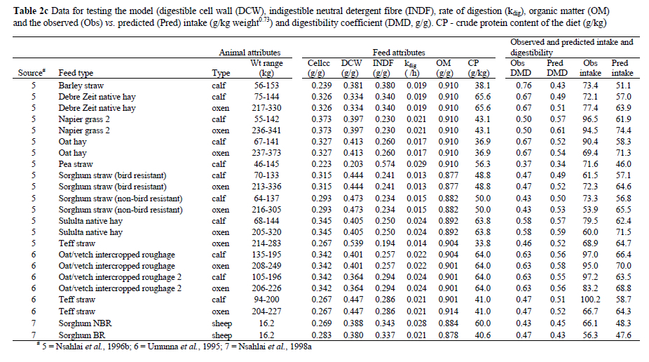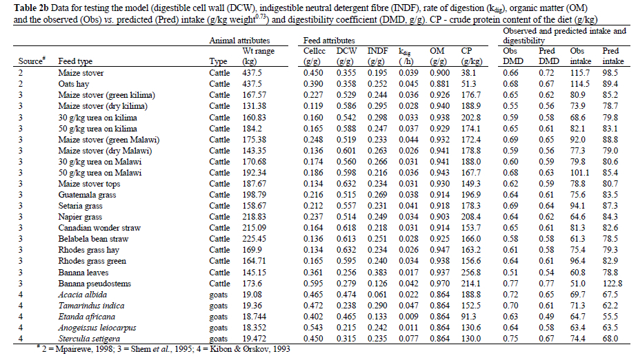 Lastly, data presented in this study was neither collected in a single location nor obtained in one season, when it is known that changes in ambient conditions (temperature, humidity, storm, etc) can profoundly affect intake. In addition, given the diverse sources of data it is possible previous nutrition might have influenced rumen DM load (Ryan, 1990) and intake. Consequently, while this model is being used in ecological systems where ruminants are allowed free access to growing herbage, it will require proper fine-tuning before it can lend its usefulness in the livestock production systems (such as in stall feeding systems) in which the selection intensity for nutritious components of food can at best only be limited. Since stall feeding enables rigorous testing in order to lend confidence to the model's predictions of intake and digestibility by animals on tropical pastures and range, such a fine-tuning process would increase its value as a component of the ecosystem models. For range and pasture studies, in sacco estimation of kdig for oesophageal fistula samples should be carried out in animals grazing the same range as the animals from which the samples are taken.