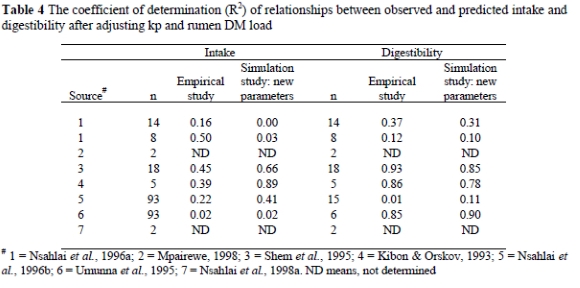 A comparison was made between the coefficients of determination (R2) obtained from the intake and digestibility values from the simulation study and from the empirical studies (Table 3). Table 3 reveals that the R2 values were generally higher in the empirical studies than in the simulation study. The best R2 for the intake relationship were 0.50 for the study by Nsahlai et al. (1996), 0.45 for the study by Shem et al. (1995) and 0.39 for the study by Kibon & Ørskov (1993). The digestibility relationships of the studies by Umunna et al. (1995), Shem et al. (1995), and Kibon & Ørskov (1993) accounted for 85%, 93% and 86 % of the variation, respectively.