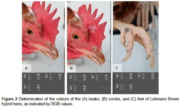 For the digital photography, each bird was removed from its cage and photographed from a distance of 30 cm. RGB colour codes were determined using Adobe Photoshop® (v. 24.1.0.) to analyse the images captured by the digital camera (Calvini et al., 2020; Annum & Poku, 2021). Within Adobe Photoshop®, the means of the red, green, and blue colour scores were obtained by selecting three areas, each 100 × 100 pixels in size, from the feet, beaks, and combs of each bird (Figures 2 and 3). RGB values ranged from 0 to 255 (Kanjanavasoontara & Suppitaksakul, 2023; Leyferman et al., 2023).