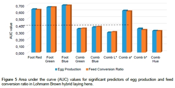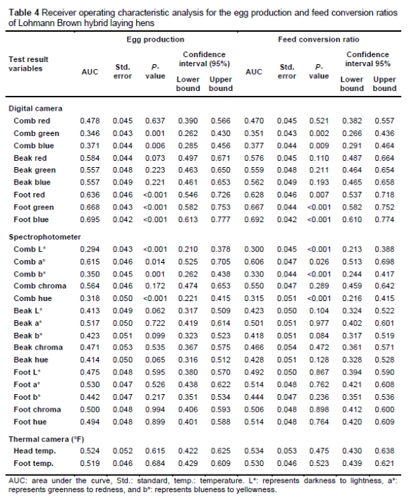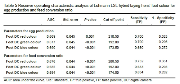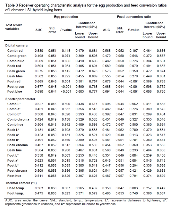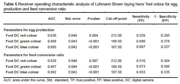 In this study, we investigated body colour changes as the initial physiological markers for identifying low-producing hens. Receiver operating characteristic analysis was conducted to discern the potential link between foot, comb, and beak colour values and egg production (low: <60% and high: >60%) and feed efficiency (low: FCR >3 and high: FCR <3). This analysis aimed to establish optimal thresholds for these parameters and classify hens as low- or high-producing based on these values. The parameters associated with egg production and FCR exhibited similar trends (Tables 3 and 4).