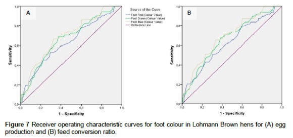 In the Lohmann Brown hybrid laying hens, consistent cut-off values were observed across both egg production and feed conversion ratio parameters: 212.0 for red, 188.5 for green, and 167.5 for blue (Figure 7, Table 6). According to the findings of this study, approximately 70% of the birds showing values higher than the cut-off points indicated for foot colour in Tables 5 and 6 may have low production potential, which reflects a statistically reliable level of discrimination (DeSalvo et al., 2005; Gur et al., 2010; Nezic et al., 2016).