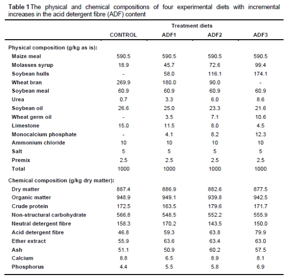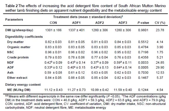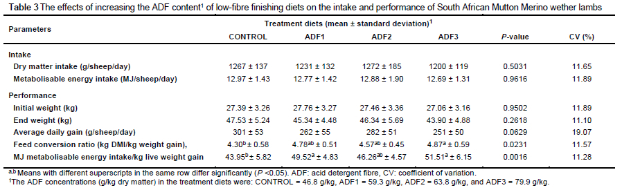 Scholtz et al. (2009) found that in dairy diets, the ADF content of the lucerne hay used was the parameter most closely related to milk yield potential, and was one of the markers in the multiple linear equations used to accurately predict milk production (R2 = 0.96). Scholtz (2008) reported that the milk yield of Holstein cows decreased by 5.4% and 3.4% for each per cent increase in the ADF and NDF content of the lucerne hay, respectively. This effect of the ADF content on animal performance is comparable to the results of the current study, as the low ADF content of the CON diet resulted in significantly higher growth efficiency (Table 3), compared to the ADF1 and ADF3 treatments. Even though the effect on the ADG was not significant, the same tendency was found.