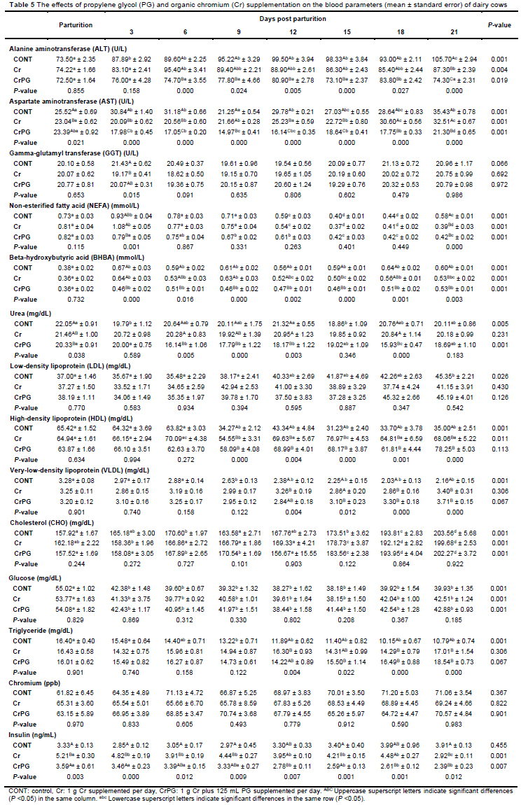 A negative energy balance commonly occurs during late pregnancy, in the first weeks of lactation, and as a result of disease (Kaniamuthan et al., 2023). Consequently, the prevention of metabolic diseases and other disorders is crucial for high milk production. The metabolic profile test developed by Payne & Payne (1987) significantly contributes to veterinary medicine by analysing biochemical parameters in the blood of dairy cows. This test confirmed that elevated AST and ALT levels indicate liver damage or stress. A reduction in hepatic fat can alleviate liver stress, consequently lowering the AST and ALT levels (Yang et al., 1996). These findings are consistent with the findings of this study, as AST and ALT levels were lower in the treatment groups than in the CONT group, suggesting that Cr and PG supplementation protected the cows against fatty liver syndrome. Chromium improves insulin sensitivity, aids in more efficient glucose utilisation, and decreases the liver's need to generate glucose from non-carbohydrate sources, thereby reducing liver stress. Furthermore, PG serves as a glucose precursor, providing extra energy and alleviating the metabolic load on the liver (Krogh et al., 2011).