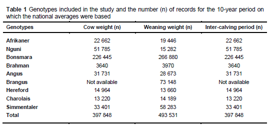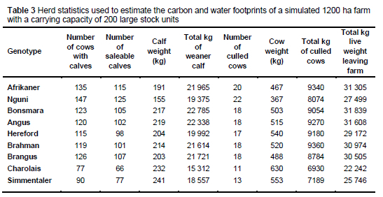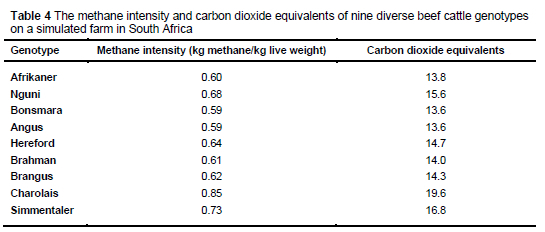 A simulation study was used to estimate the methane production (expressed as the methane intensity in kg methane/kg live weight) and blue water footprint of a weaner calf production system for diverse beef cattle genotypes. Nine beef cattle genotypes were chosen, based on the number of animals and the availability of data. The genotypes included were the Afrikaner and Nguni (Sanga), Bonsmara (Sanga-derived), Angus and Hereford (British), Brahman (Zebu), Brangus (Zebu-derived), and Charolais and Simmentaler (European).