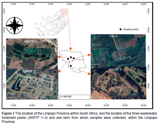 Cow faeces, palatable grass, and sludge liquor samples were collected from three WWTPs and one farm, all located in the Limpopo Province of South Africa. Figure 1 shows the location of the sampling points within the Limpopo Province. Wastewater treatment plant 1 (WWTP1) consists of three waste stabilisation ponds (two primary and one secondary maturation pond), while WWTP2 and WWTP3 are used for activated sludge wastewater treatment processes. Cow faecal samples were collected at WWTP1 and WWTP2, as these have damaged perimeter fences and regularly receive visits from cows from neighbouring villages that graze within the facilities. Cow faecal samples were also collected from a privately-owned farm some distance from the WWTPs, for comparison. Plant (palatable grass) and sludge liquor samples were collected from WWTP2 and WWTP3, as these facilities generate sludge. The dried sludge residues are normally spread on the nearby grass or given to community members for use as manure. The three WWTPs were selected because of their accessibility and the visible presence of cow faeces and cattle grazing within their perimeter fences.