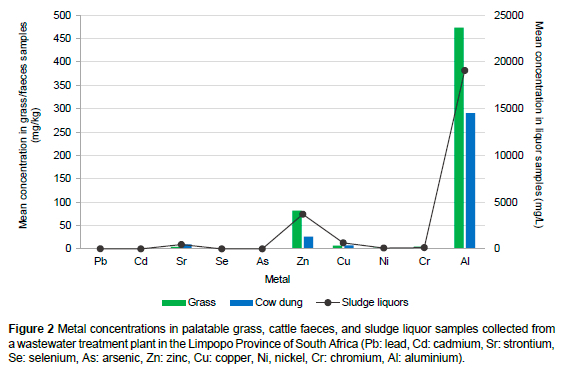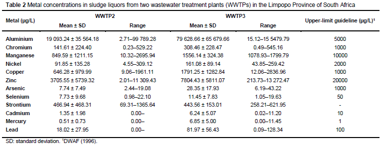 As cows have been observed drinking these sludge liquors on several occasions, particularly at WWTP2, the mean concentrations of heavy metals recorded in these liquors were compared to the Department of Water Affairs and Forestry (DWAF) (1996) guidelines for livestock consumption. The mean concentrations of aluminium in liquor samples from both WWTPs exceeded the permissible limits for cattle consumption. The mean levels of copper and mercury in the liquor samples from WWTP3 also exceeded these limits. The mean concentrations of other metals, such as lead, did not exceed the limits, but were very high and exceeded the limits in some samples.