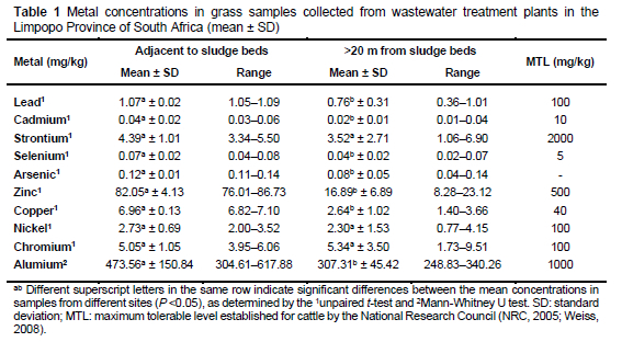 The levels of metals in the palatable grass samples collected from the WWTPs are presented in Table 1. The concentrations of the metals were in the order: aluminium > zinc > copper > chromium > strontium > nickel > arsenic > selenium > cadmium. Of the ten heavy metals commonly found in wastewater treatment sludges, none exceeded the maximum tolerable limits for heavy metals in cattle feed in either the grass samples from sites next to the sludge beds or those further away. Other than for strontium, nickel, and chromium, significantly higher levels of heavy metals were detected in plants collected near the sludge beds than in plants collected further away from the sludge beds.